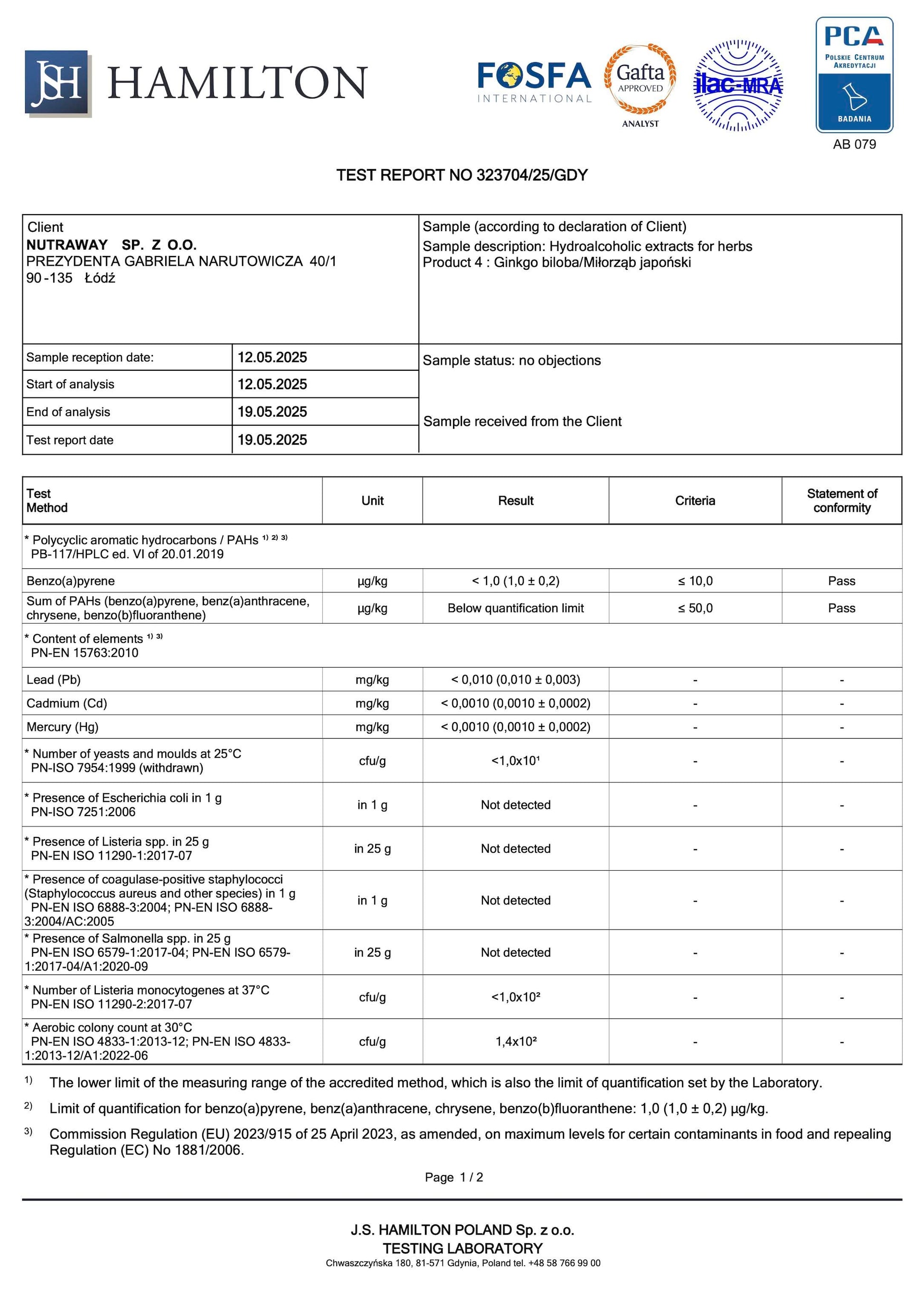 Recherche menée par J.S. Hamilton Poland Sp. z o.o. pour le compte de Nutraway Sp. z o.o., propriétaire de la marque privée Ollywell. Des échantillons d'extrait liquide de Ginkgo Biloba ont été testés. L'étude a été réalisée selon une méthode accréditée, et les résultats ne s'appliquent qu'aux échantillons reçus. Tous les résultats présentés dans le rapport sont inférieurs aux niveaux maximaux admissibles de contaminants spécifiés dans le Règlement de la Commission (CE) n° 1881/2006 du 19 décembre 2006. Cela signifie que l'extrait liquide de Ginkgo Biloba est sûr pour la consommation.